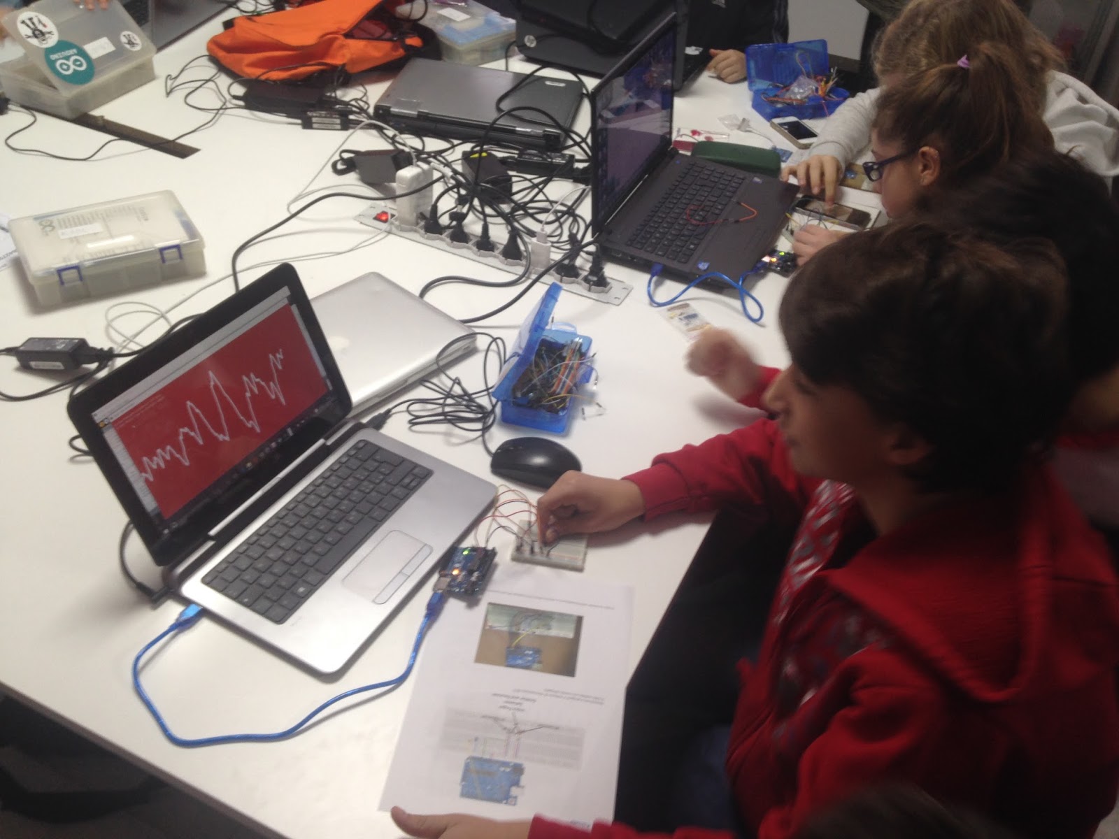 Quindi i tre gruppi si sono ruotati ed è stata la volta dei ninja del Gruppo 1 affrontare Arduino. Anche per loro è stato divertente vedere a schermo l’onda della propria frequenza cardiaca!
