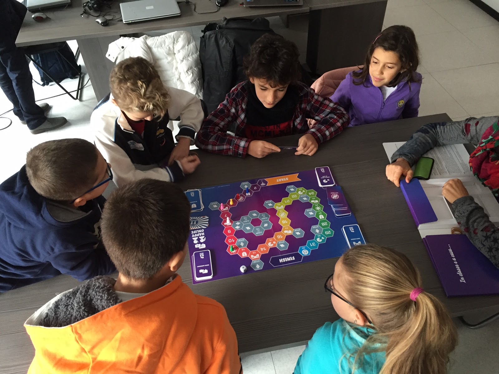 Intanto il Gruppo 2 (10-11 anni), suddiviso su tre tavoli da gioco, ha iniziato l’esperienza di gioco con Happy Onlife, il gioco in scatola gentilmente fornitoci dal gruppo JRC della ECC, ideato al fine di promuovere la sicurezza nell’utilizzo di Internet e prevenirne l’abuso.