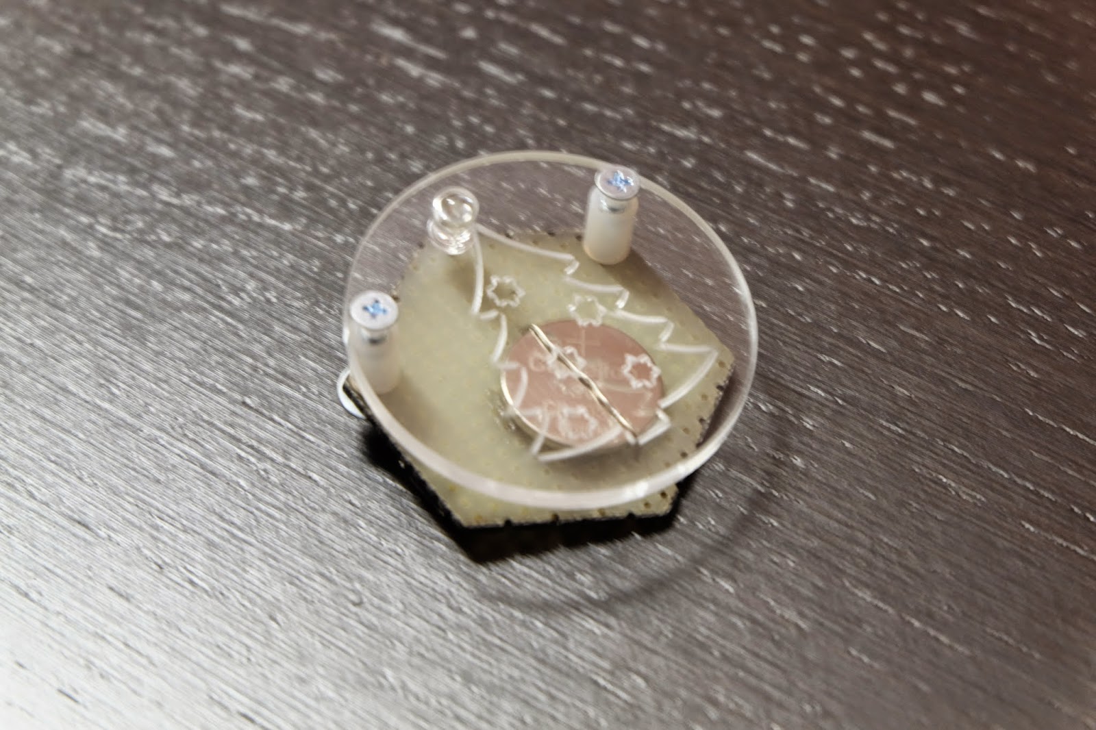La CR2032 viene poi bloccata, un po’ rocambolescamente, da un filo che oltre a far contatto (con il polo positivo) se ben tensionato riesce a tenerla in posizione. Un cerchio in plexiglas con inciso a laser un alberello di Natale è fissato da un paio di bulloni 3 MA.
