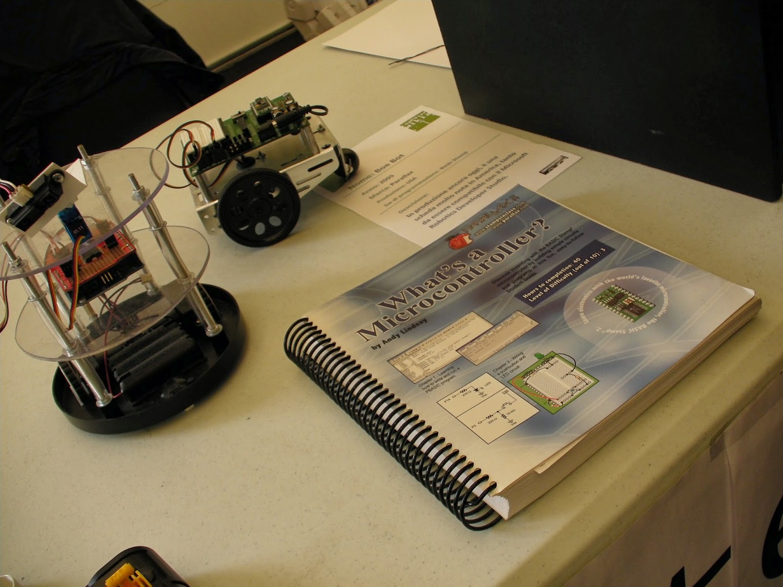 Arduino è proprio il micro-controllore che sta alla base del nostro esempio autocostruito. “Arduino” era forse la parola più pronunciata di tutta la fiera, seconda forse solo a “stampa 3D”. Il progetto Boe Bot di Parallax qui affiancato è un illustre predecessore.
