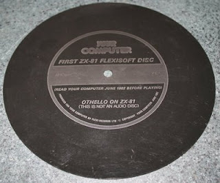 Seguendo il concetto che una cassetta contiene i dati in un formato audio, non è così stupefacente trovare un programma memorizzato in un vinile. Il fatto insolito è però dato dal fatto che il disco qui raffigurato è flessibile e morbido, un po’ come l’interno di un floppy da 5″1/4 !