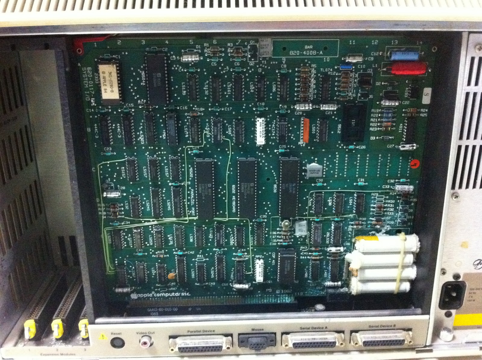 Poi è toccato all’Apple Macintosh XL (Lisa 2). Subito la piastra ha dato alcune preoccupazioni a causa di forti fuoriuscite di ossido dalle batterie tampone, ma con il variac abbiamo provato a verificare se l’esemplare poteva dare segnali positivi.