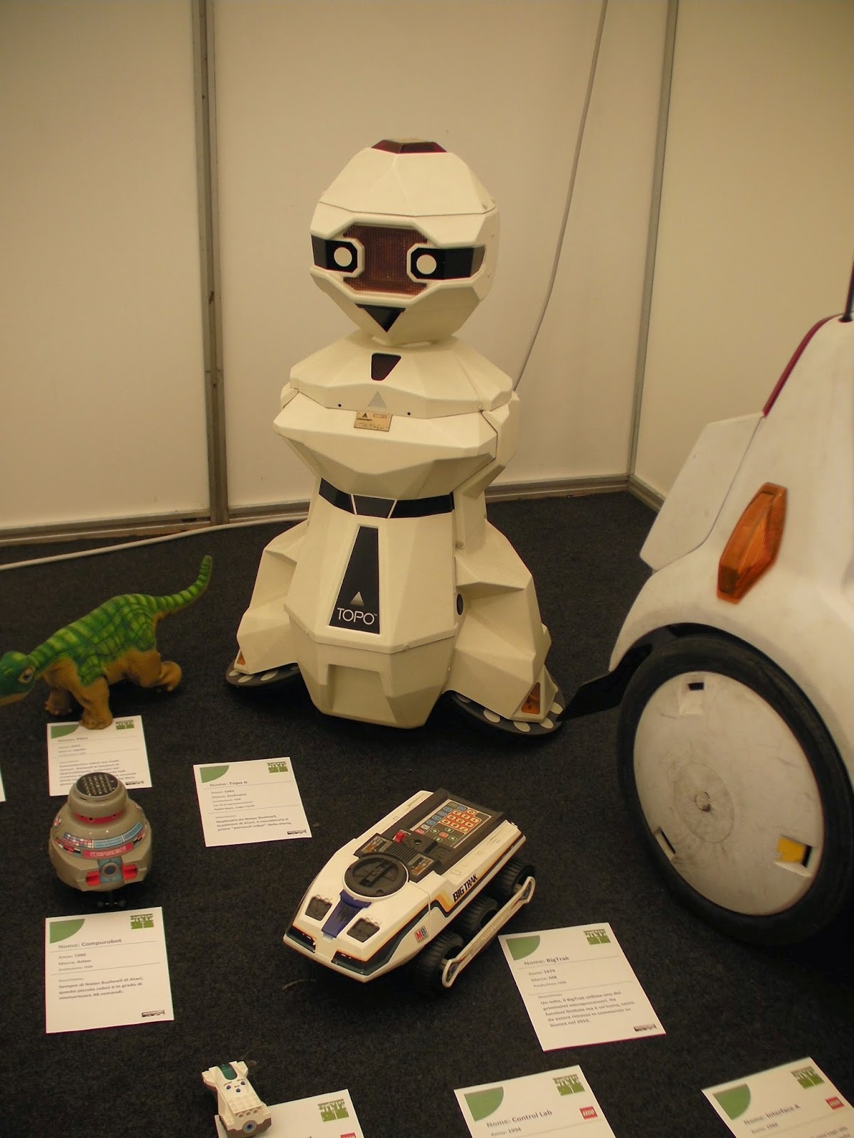 Chiudono questa lunga carrellata Teddy Ruxpin,  Roborover, lo splendido Tomy Omnibot. Sullo sfondo Percival ed Emiglio che saluta col il braccio alzato. Proprio quest’ultimo è stato riconosciuto da numerosi visitatori ed oggetto di alcuni scherzi tra noi espositori.