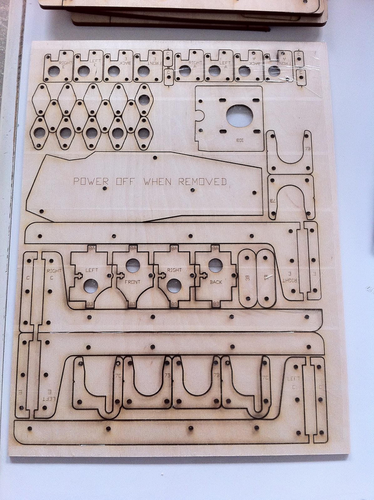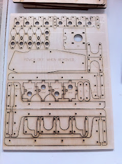 L’oggetto arriva infatti smontato, la struttura, realizzata a taglio laser con notevole precisione, si presenta in 5 “fogli” di legno dello spessore di 5 mm circa. Eccone uno :